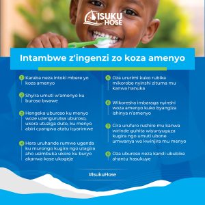 Ati: “Abantu bakwiye kwitabira gukora isuku mu kanwa, boza amenyo nibura inshuro 2 ku munsi ariko cyanecyane mbere yo kuryama, kubera ko bya biryo bariye iyo bimazemo igihe bihinduka umwanda, maze udukoko two mu kanwa cyangwa mikorobe tukabikoresha dukora acide icukura amenyo, bigatuma yangirika.”