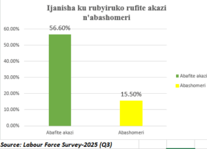 Ikigo cy’Igihugu cy’ibarurishamibare (NISR) kandi mu bushakashatsi bwacyo ku bakora n’abashomeri mu Rwanda, igihembwe cya 3-2025 kigaragaza ko ijanisha ku rubyiruko rufite akazi, ni ukuvuga kuva ku myaka 16-30 ari 56,6% naho urubyiruko rw’abashomeri ari 15,5%.
