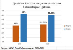 Raporo y’Ikigo k’Igihugu cy’ibarurishamibare (NISR) ku ibarura ry’ibigo (enterprises) mu Rwanda guhera mu mwaka wa 2020 kugera mu mwaka wa 2023 yerekana ko umubare wa ba rwiyemezamirimo b’abagore ukiri hasi ugereranyije n’uw’abagabo, aho mu mwaka wa 2020 abagore bari kuri 37% bagera kuri 39.5% mu mwaka wa 2023, naho abagabo bari kuri 63% mu mwaka wa 2020 bagera kuri 60.5% mu mwaka wa 2023.
